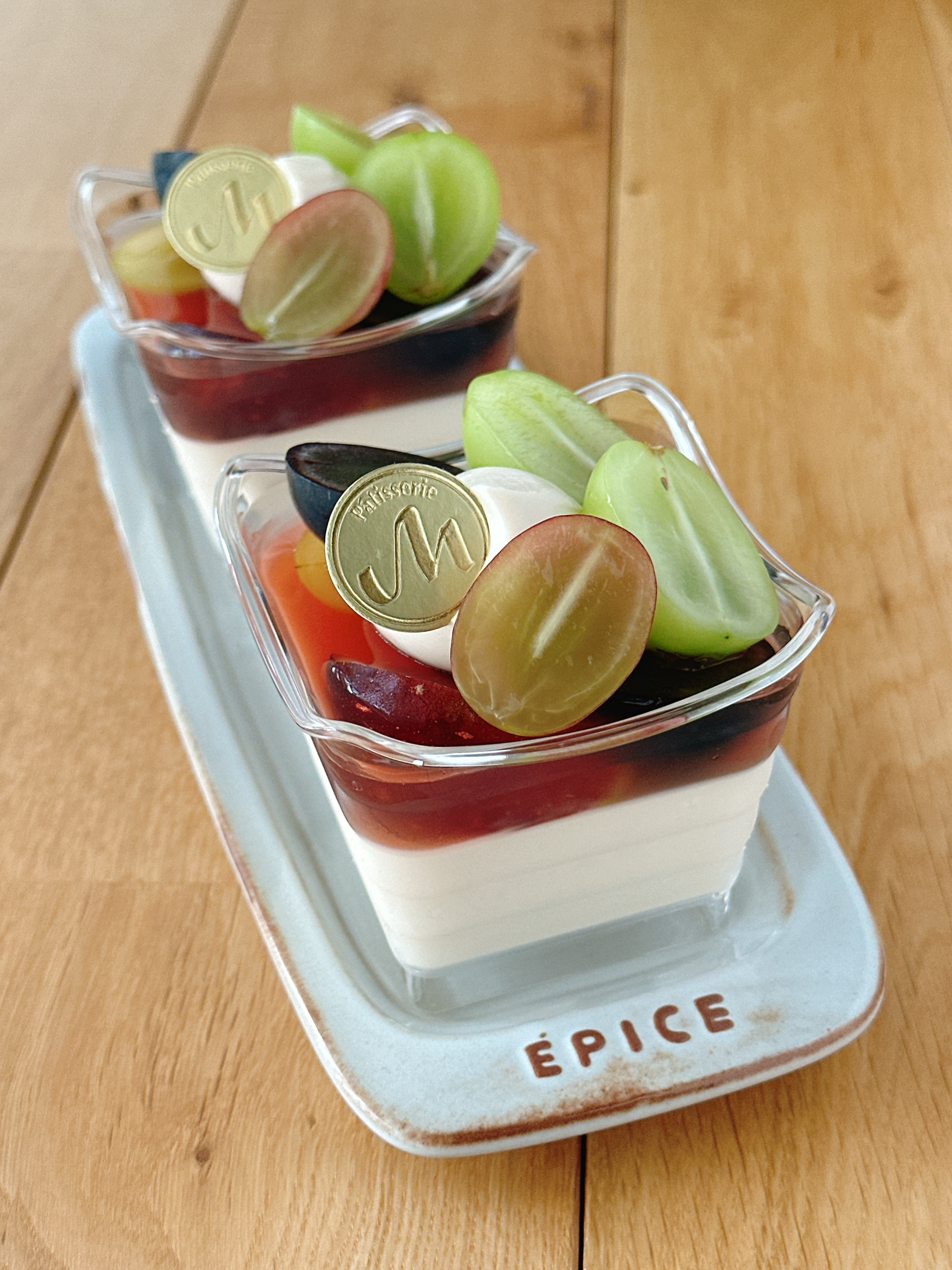 今週はレアチーズの上に3種のぶどうといちじくをゼリー寄せ。スポンジはなしです。
